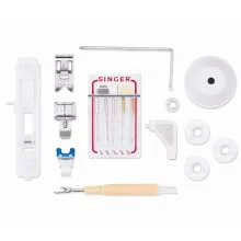 Coser es más fácil cuando se tienen los accesorios adecuados, ¡SINGER incluye accesorios para empezar rápidamente! Los accesorios incluyen pie universal, pie para cremalleras, pie para ojales, pie para coser botones, rasgador de costuras/cepillo para pelusas, guía de acolchado, aguja, bobina, destornillador, portacarretes auxiliar, fieltro para portacarretes y funda guardapolvo blanda.